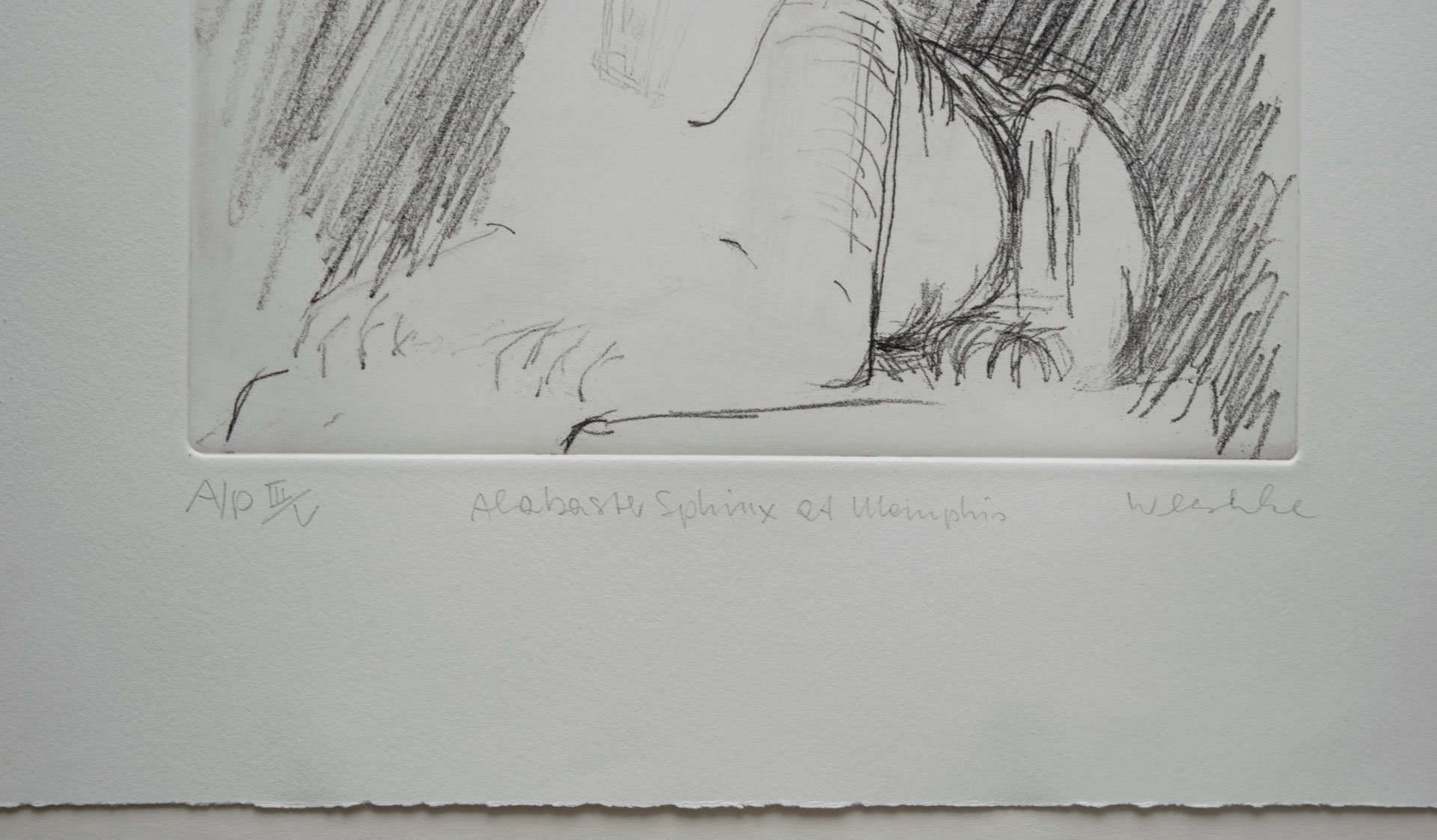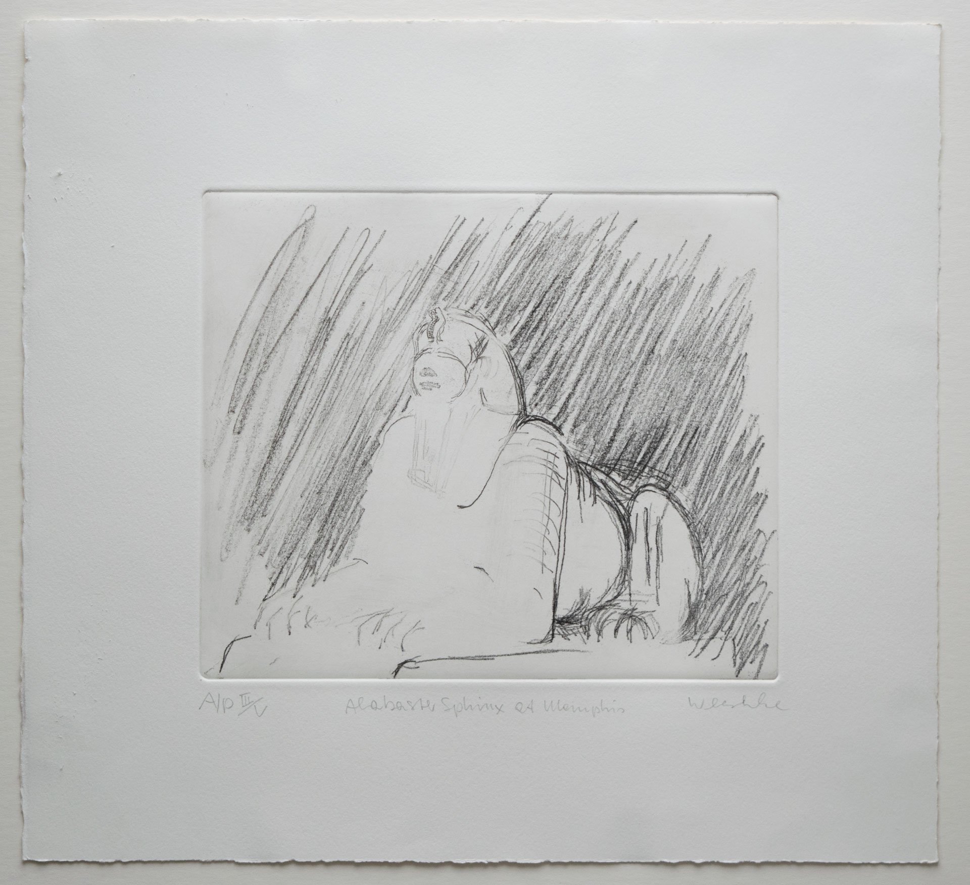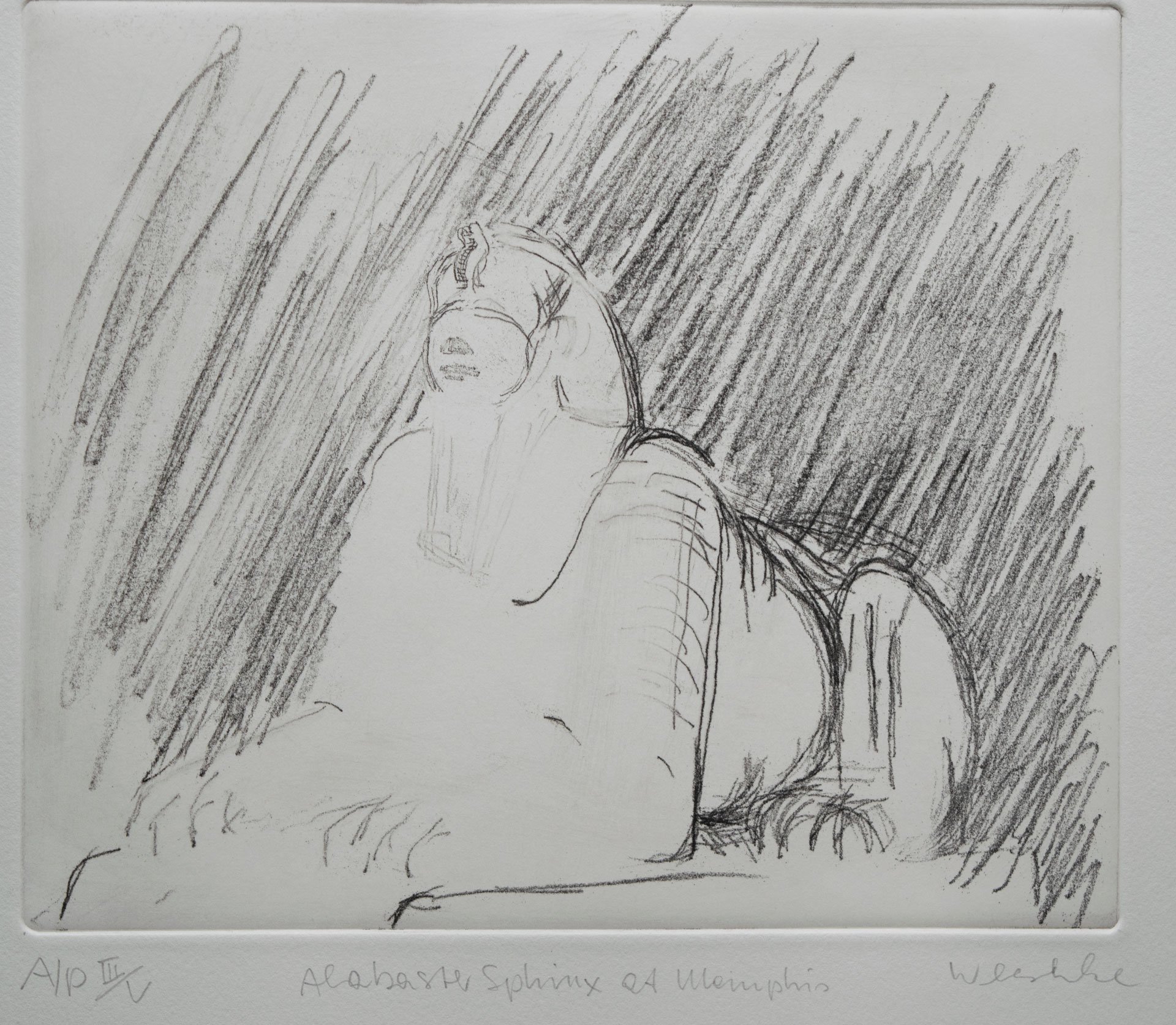 The Alabaster Sphinx at Memphis is part of The Egyptian Suite, a set of six original etchings on copperplate. This series of prints gave Weschke the opportunity to demonstrate his ability to render, in the form of an enduring visual artefact, the essence of what he had witnessed on his travels to Egypt. In this work, he has captured his passion and fascination for timelessness and relevance of the magnificent artefacts left by the ancient Egyptians. One is reminded too of his enduring admiration for the big cats, undoubtedly part of the reason he was drawn to this particular subject.