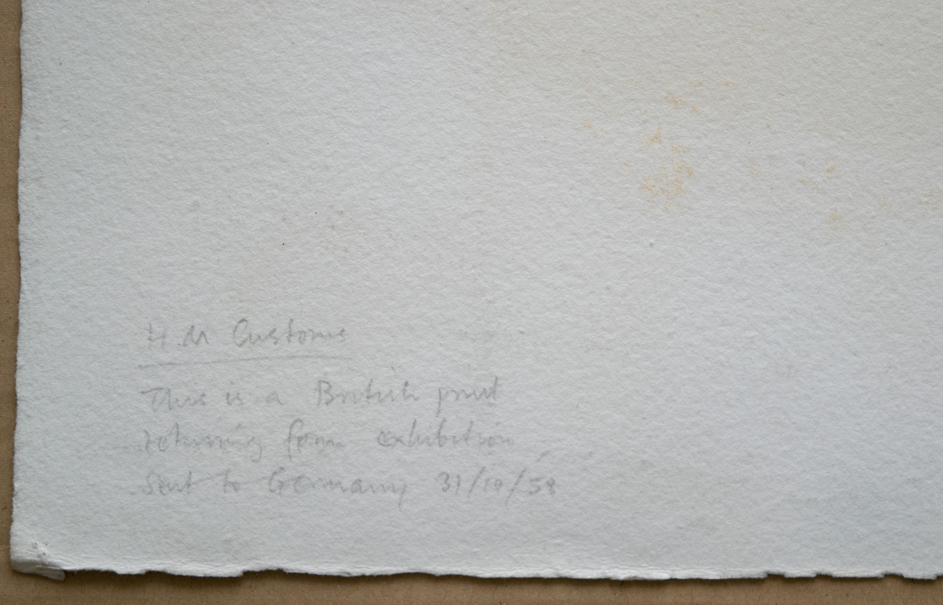 A beautiful lithograph in a period frame. This is an early work and has a pencil note on the reverse, referring to it’s journey to/from an exhibition in Germany. This is sold directly for a member of the Weschke family.