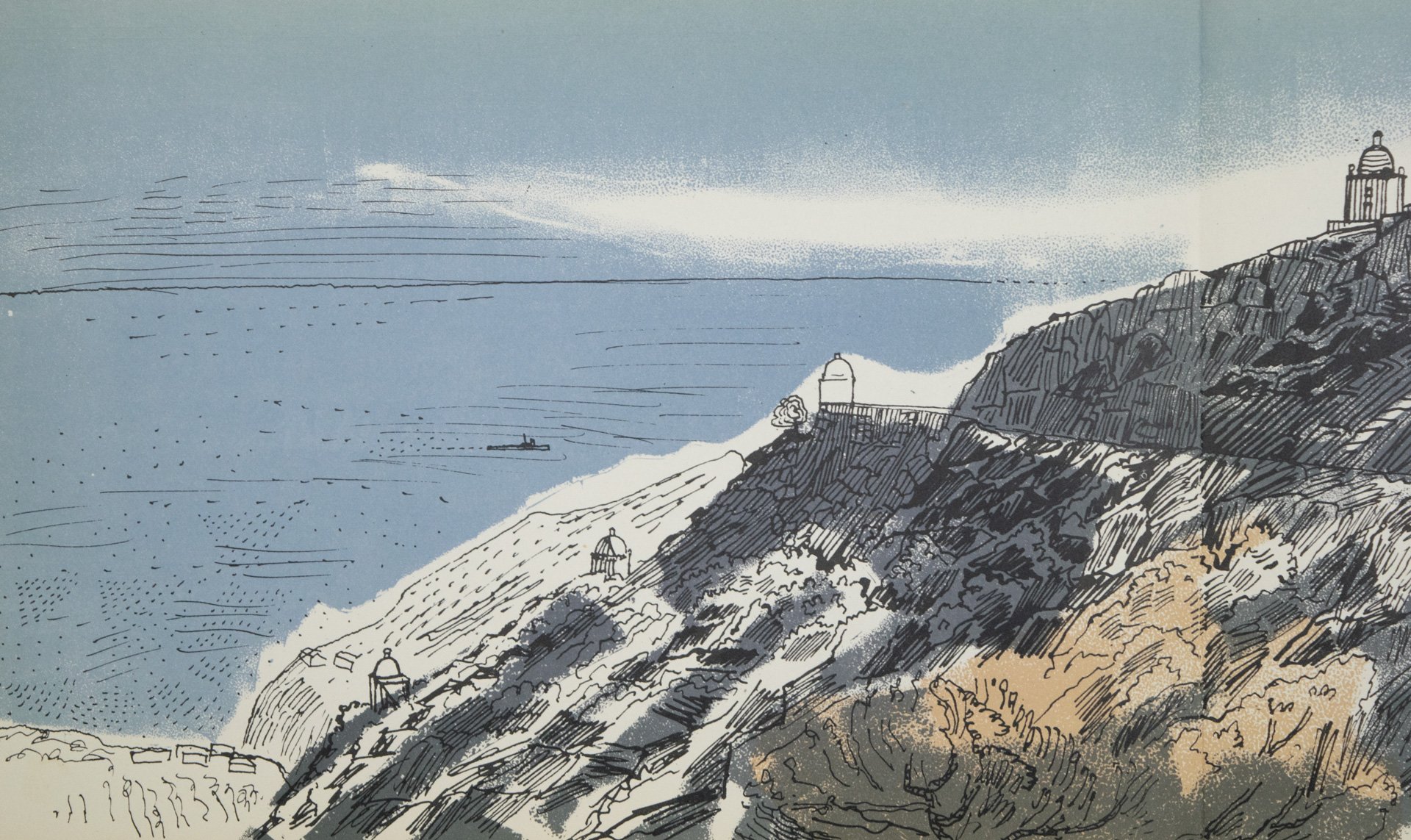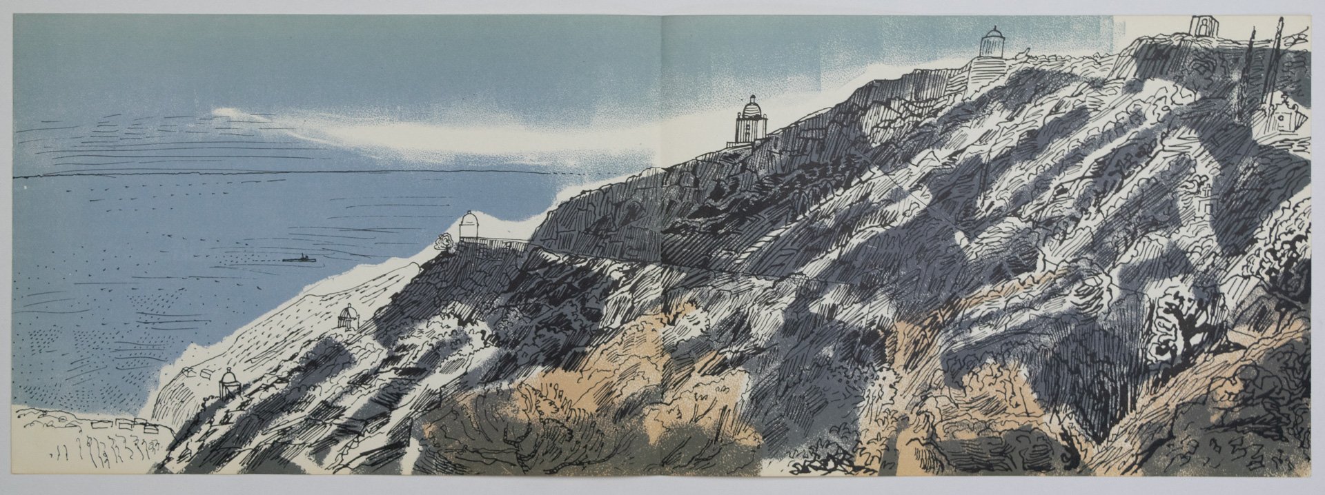 Here we have a wonderful lithographic print of a landscape from an unbound printers proof copy of the 1960s rare book English As She Is Spoke, illustrated by Edward Bawden.