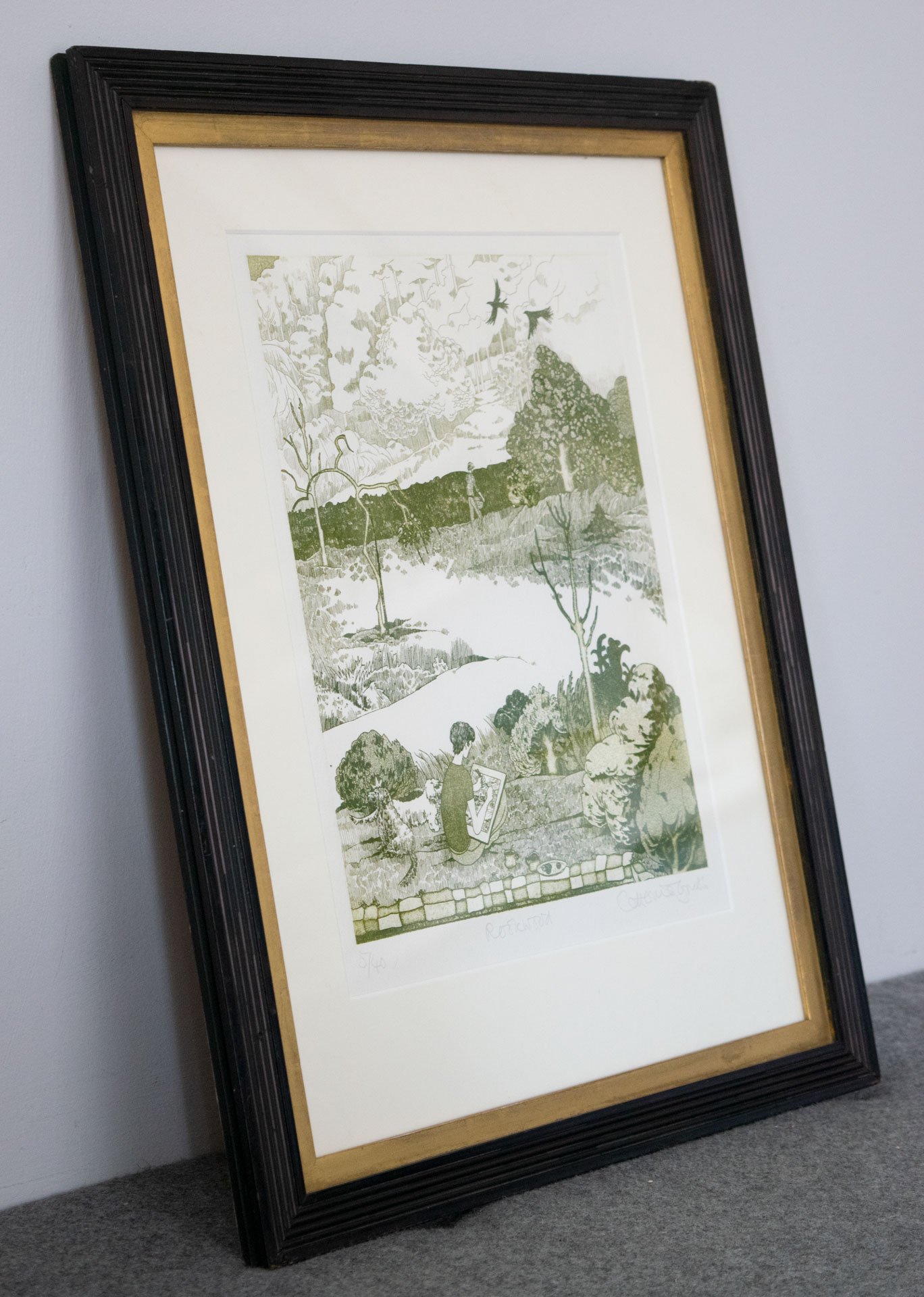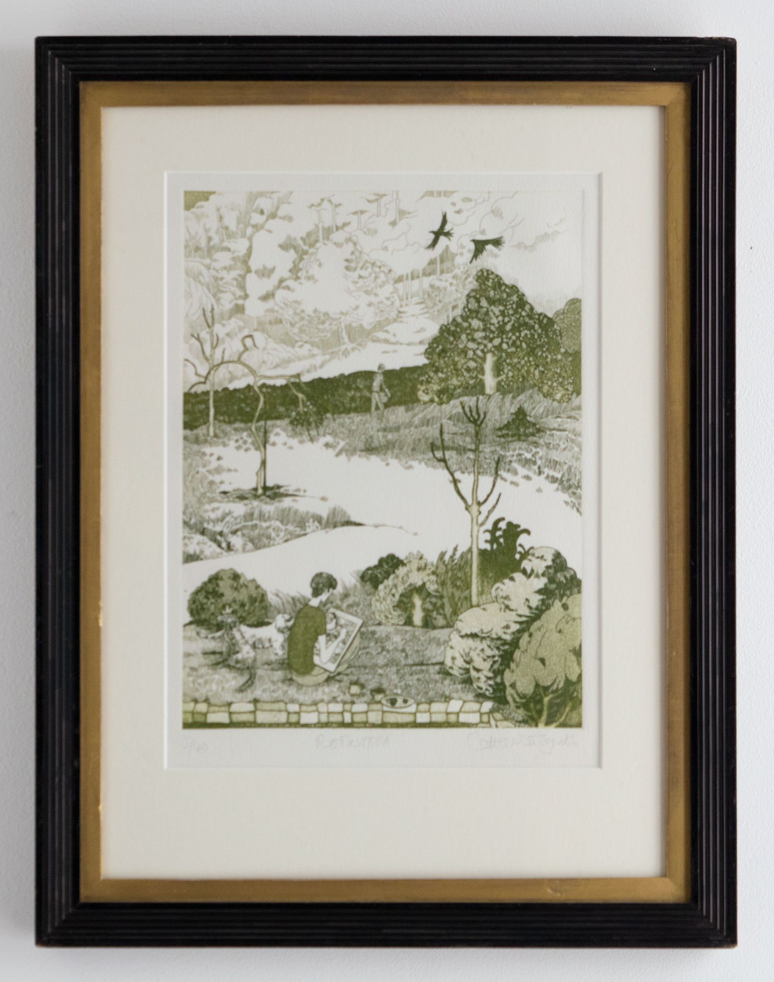 This green aquatint etching is an unusual style of image for her, and it looks very charming in its reconditioned frame.