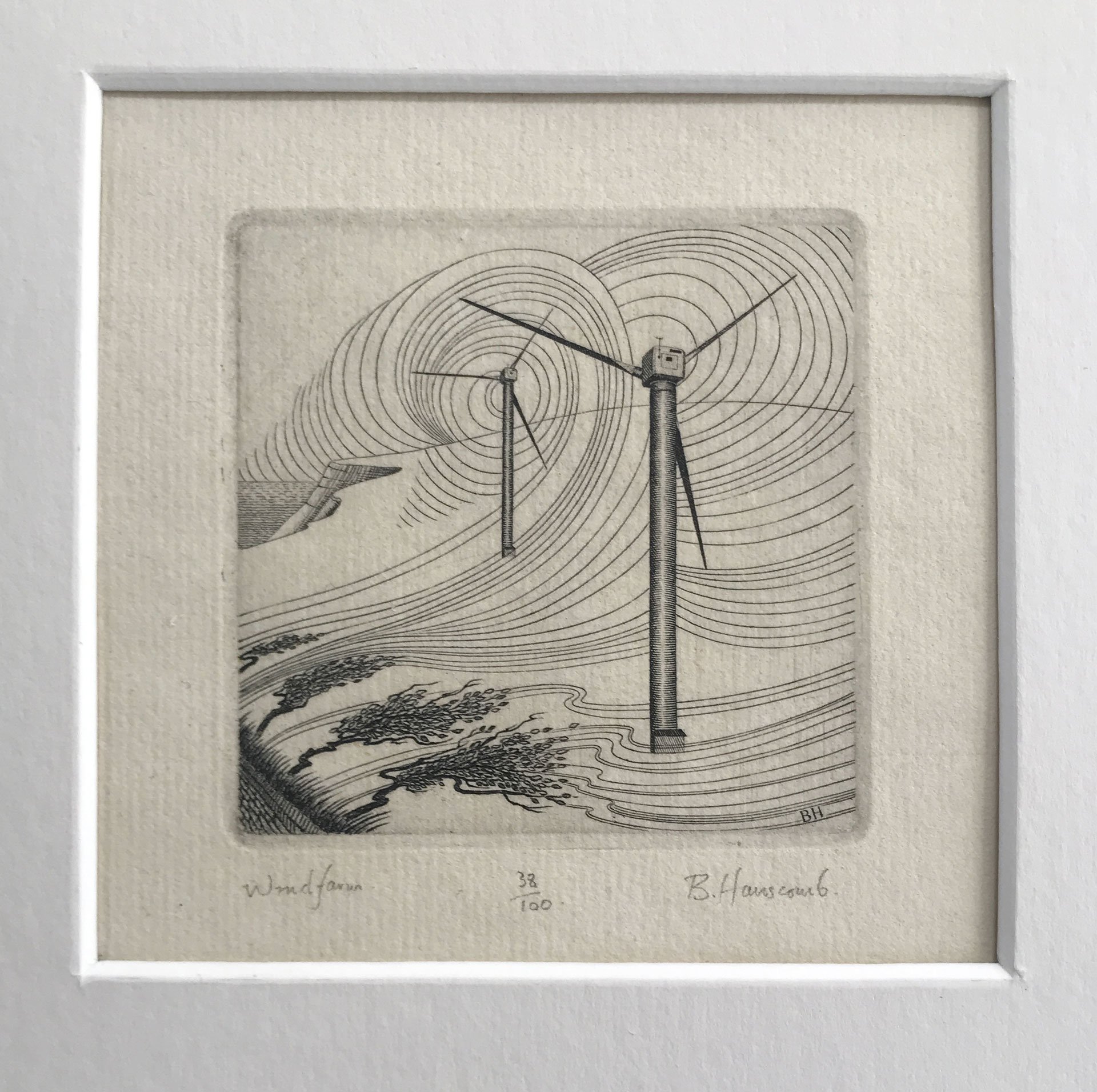 Small engraving by Brian Hanscomb (b. 1944) on the controversial topic of windfarms and wind turbines. This work perhaps captures the architectural beauty of windfarms. The engraving was inspired by the building of the first wind farm in Britain, at Deli Farm, Delabole, Cornwall in 1991 and is in the Science Museum Collection. Other work by Hanscomb is held in the British Government art collection.